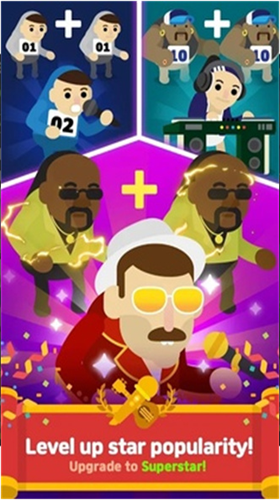 在Merge Musician的世界里,玩家需要精准匹配相同属性的艺人进行升级。舞台经营系统让您随时收获演出收益,离线时段仍可持续积累人气值。游戏内设置的随机宝箱机制,每天登录都能触发意外惊喜,钻石奖励更助力解锁新角色。