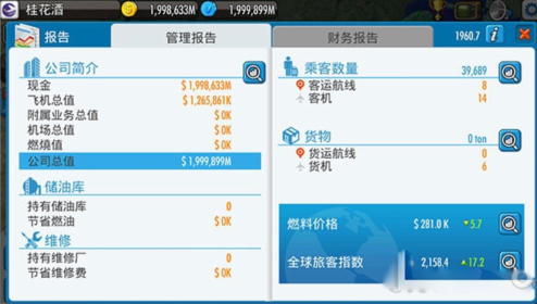 游戏采用季度进度制,每个经营周期需完成机队部署、服务升级、航线优化等决策。飞机改装模块包含30天交付周期设定,提前规划显得尤为重要。安全管理系统会记录每次机械故障处理方案,长期忽视维护将影响保险公司承保条件。