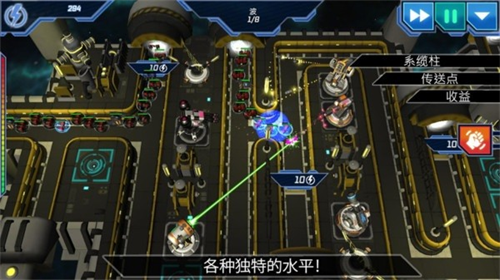 游戏内设动态防御系统,31种科幻炮塔涵盖电磁脉冲装置、粒子射线矩阵等创新设计。每个防御单元均可通过元素模块进行三次强化升级,例如将基础冰霜塔改造为附带减速场的极寒核心。战略地图支持六向旋转视角,玩家可实时观察各路线敌人动态,及时调配双联装速射炮等机动单位进行精准拦截。