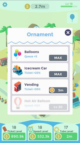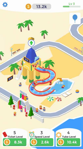 游戏采用渐进式难度设计,新手教程结束后将解锁完整建造系统。玩家可自由搭配水滑梯、造浪池、漂流河等经典项目,通过合理动线规划提升游客满意度。当特定设施组合达成时,会触发限时收益翻倍效果,考验管理者的决策能力。