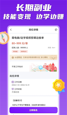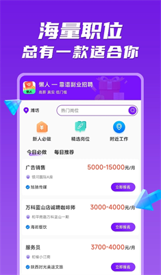 灵活兼职轻松赚钱快速上岗由君诚人力资源服务(济南)有限公司研发的移动端应用,致力于为求职者打造高效便捷的线上兼职服务平台。通过智能算法与海量岗位资源库,该应用可实现用户需求与用工方的高效衔接,支持短期任务、远程协作、即时用工等多种工作模式,满足学生、宝妈、自由职业者等群体的灵活就业需求。