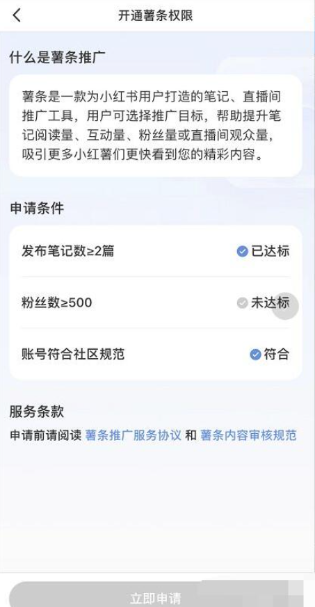 在功能菜单中定位"薯条推广"选项,这是小红书为创作者提供的官方流量助推工具。点击后会进入推广设置界面,初次使用需要完成相关协议确认。