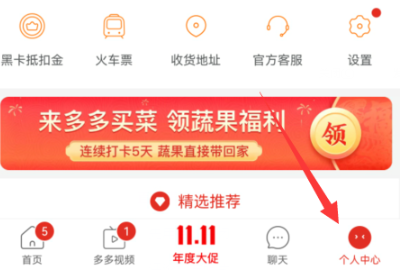 1、启动拼多多客户端后,点击界面右下角「个人中心」入口