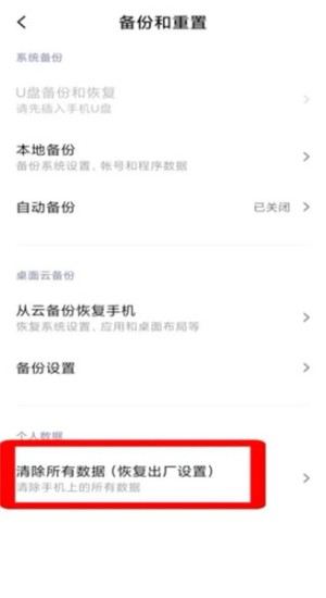 第三步进入数据管理模块。选择"备份和重置"功能单元,该区域包含云备份、本地备份、账户同步等数据保护功能,同时提供系统恢复选项。建议操作前完成重要资料备份。