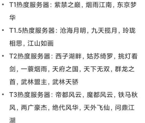 T1精锐区组:紫禁之巅、烟雨江南、东京梦华三大服务器组成第二梯队。这些区服保持着良好的生态平衡,既有稳定的老玩家群体,又持续吸引着新鲜血液,特别适合注重社交体验的玩家选择。