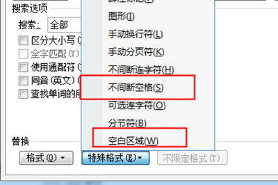 6、在特殊格式菜单中选择【空白区域】或【不间断空格】标识符,这些隐藏符号常由网页复制时自动生成