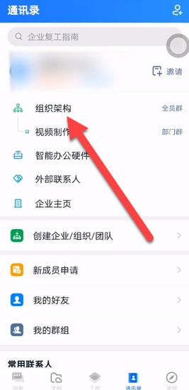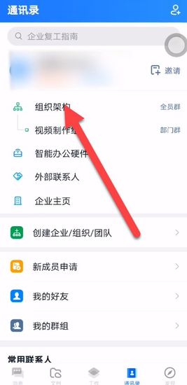 3、选定企业后点击「组织架构」入口。该界面完整呈现企业的部门树状结构,普通成员可见自己所在分支,管理员可查看完整架构。