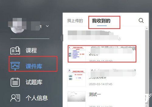 3、成功进入个人教学空间后,导航栏选择"课件库"模块。该模块细分为"我上传的"和"我收到的"两个分类标签,用户可根据课件来源切换查看权限,支持按时间排序和关键词检索功能。