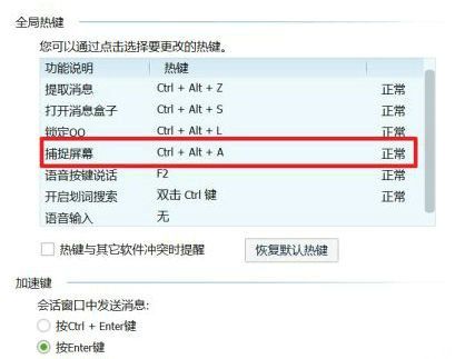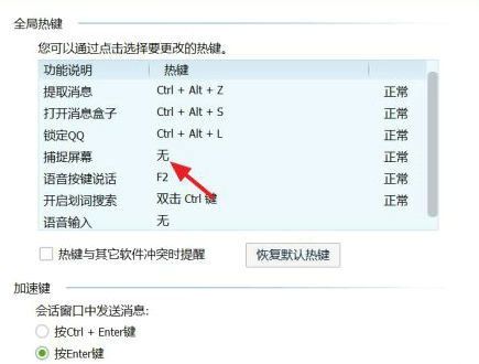 5、系统检测到热键冲突时会出现红色警示,此时可依次关闭正在运行的程序进行冲突源排查,或直接修改QQ热键配置方案