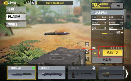 3、进入战术近战装备界面后,定位屏幕右侧的枪械工匠功能按钮。该功能模块专门用于管理武器皮肤和特殊配件,包含各类限定装备的获取通道。