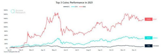 市场监测机构Arcane Research披露的统计数据显示,在主流加密资产竞争格局中,币安币展现出显著竞争优势。2021年度其市值增幅远超比特币65%与以太坊408%的同期表现,这既体现了底层生态的强劲发展,也反映出市场对交易所通证价值的重新评估。