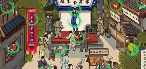 右侧区域需重点观察舞台布置,两人搬运的编织容器对应"花篮",高空角色穿着特殊服装进行特定手势表演。屋顶人物服饰的纹样设计、悬挂食材的切割形状以及树枝间的昆虫翅膀图案,分别对应三个隐藏目标。